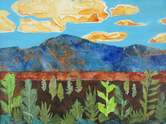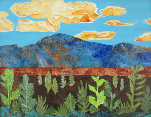 Inspired by the light, culture and natural beauty of the southwest, my main body of work, “Southwest Abstractions,” is a series of evocative landscapes celebrating our Land of Enchantment. Cultural and historic influences permeate my art. Some paintings depict actual landmarks; others depict indigenous ceremonies, pueblos and Spanish mission churches designed to capture a sense of community and cultural interconnectedness. Influenced by the Native American art of storytelling, I often incorporate images and symbols that hold deep multicultural and spiritual significance across generations. I work in a variety of mediums for I love the vibrancy of acrylics, the velvety texture of oils, and the mosaic quality of collage. My latest mixed media paintings incorporate my hand-painted papers resulting in unique effects that cannot be achieved through using paint alone. A collagist, I offer customized workshops on collage paper painting techniques and collage as an artform.