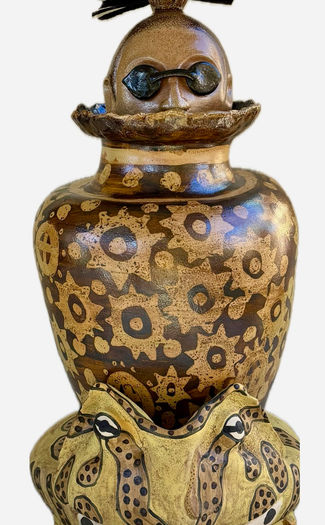 My vessels are primarily zoomorphic featuring animals and people emerging and receding. In each piece,